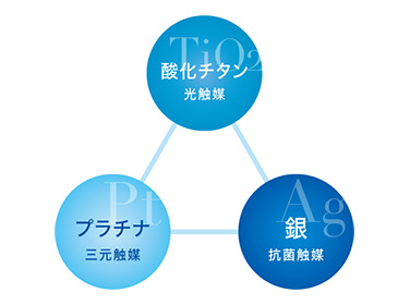 「delfino(デルフィーノ)」は、光触媒(酸化チタン)、抗菌触媒(銀)、三元触媒(プラチナ)などの触媒を組み合わせることで、それぞれの触媒反応が持つ効果を相乗的に発揮させながら、それぞれの弱点を補うという発想の抗ウイルス・抗菌・防臭剤です。